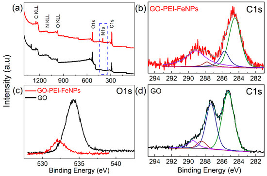 XPS of survey spectrums of the GO and GO–PEI–FeNPs foams (a). High-resolution spectrums of C1s (b,d) and O1s before and after functionalization with PEI (c).