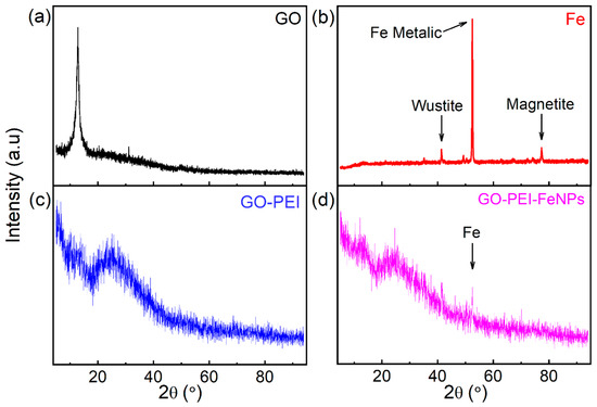 XRD diffractogram of (a) GO, (b) metallic iron, (c) GO–PEI and (d) GO–PEI–FeNPs.