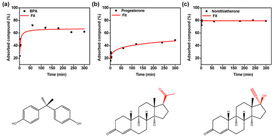 The adsorption times of BPA, progesterone and norethisterone were investigated by immersing the GO–PEI–FeNPs foam in aqueous solution at different time intervals. Figure 5 shows the percentage of adsorbed compound vs. time. A fast increase in adsorption is observed followed by a saturation point after a relatively short amount of time for all adsorbed compounds. Equilibrium was maintained for about 5 h with no changes for adsorption of BPA, progesterone and norethisterone. In the case of BPA (Figure 5a), the maximum % adsorbed compound was evaluated at 68% after 60 min. As for progesterone (Figure 5b), the maximum % adsorbed compound was assessed at 49% after 5 h. Finally, norethisterone (Figure 5c) had the highest % adsorbed compound of 80% after just 30 min of contact time. These different adsorption behaviors could be related to the different mechanisms controlling the adsorption process of the different endocrine disruptors. In particular, the presence of Csp2 bonding in all studied compounds allows a strong interaction with the GO plane via π–π stacking. Furthermore, the hydroxyl groups in BPA and the ketone and alkyne groups in the norethisterone can also be adsorbed to the GO foam via hydrogen bonding. As for progesterone, since it only possesses two ketone groups as functional groups, interactions with the foam could be weaker compared to its interactions with BPA and norethisterone, which can explain the lower adsorption by the membrane.