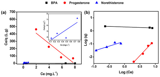 The adsorption capacity against the equilibrium concentration for BPA, progesterone and norethisterone at room temperature and under 60 rpm stirring rate are presented in Figure 6. Two models were investigated, the Langmuir and Freundlich models, to establish and determine the most suitable adsorption mechanisms for all compounds [32,33,42,43].