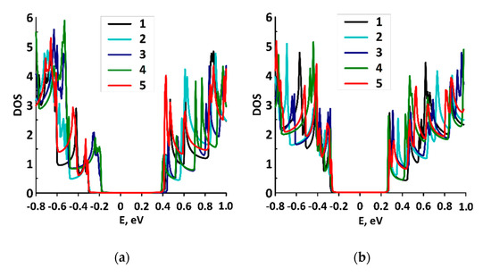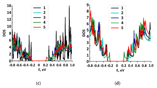 DOS graphs of graphene/SWCNT composite films with different SWCNTs at different distances H1/H2 between SWCNTs: (a) film with SWCNT (10,0), numbers 1–5 correspond to the distances H1/H2 6/7–6/11 hexagons; (b) film with SWCNTs (12,0), numbers 1–5 correspond to the distances H1/H2 7/8–7/12 hexagons; (c) film with SWCNT (14,0), numbers 1–5 correspond to the distances H1/H2 8/9–8/13 hexagons; (d) film with SWCNT (16,0), numbers 1–5 correspond to the distances H1/H2 9/10–9/14 hexagons.