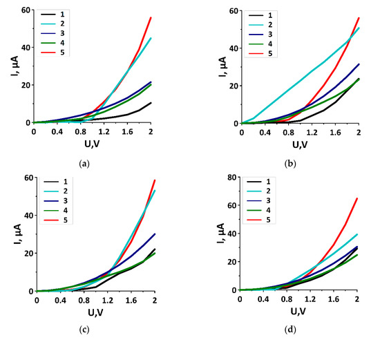 Families of volt-ampere characteristic (VAC) curves of graphene/SWCNT composite films: (a) film with SWCNT (10,0) and H1/H2 6/9 hexagons; (b) film with SWCNT (12,0) and H1/H2 7/10 hexagons; (c) a film with SWCNT (14,0) and H1/H2 8/9 hexagons; (d) film with SWCNT (16,0) and H1/H2 9/14 hexagons. The curve with the number “1” denotes the composite film with the corresponding SWCNTs, the curve with the number “2” denotes the SWCNTs from the composite film, the curve with the number “3” denotes the initial SWCNTs, the curve with the number “4” denotes the initial graphene, and the curve with the number “5” denotes the graphene from the composite film.