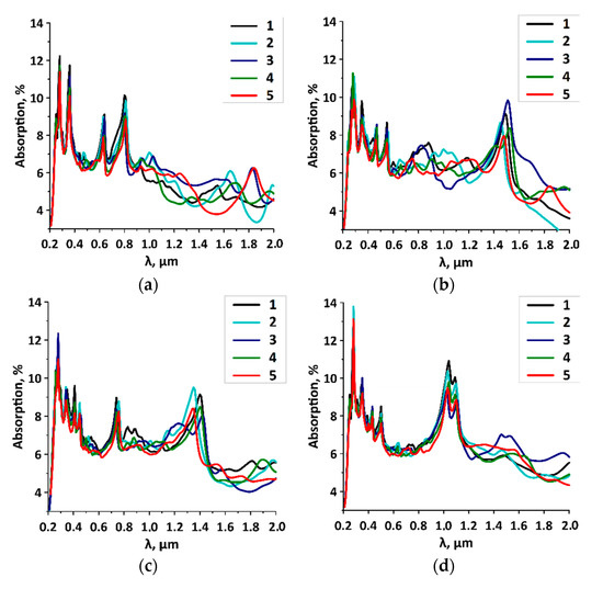 The calculated absorption spectra for different variations of the distances between the SWCNTs are shown in Figure 4. For SWCNT (10,0; Figure 4a), SWCNT (12,0; Figure 4b), SWCNT (14,0; Figure 4c), and SWCNT (16,0; Figure 4d), two cases of the distances H1/H2 are shown. These two cases were chosen because of the greatest difference in the absorption spectra. The graphs show that for all types of films, regardless of the diameter of the tubes and the distance between them, there was a noticeable peak of absorption intensity of 11–14% at the wavelength of 265 nm. The presence of this peak in the spectrum is explained by the presence of the graphene sheet, which is known to have an absorption peak of ~7% at the wavelength of 265 nm [34]. The second intensity peak, when a(ω) reaches ~10%, was observed in the IR region at the wavelengths of 1000–1500 nm. It appeared in the spectra of composites with the SWCNTs with diameter of 1 nm or more, regardless of the tubes’ step of arrangement. Another distinctive feature of all a(ω) spectra was the presence of clearly defined absorption peaks in the visible region of 500–750 nm. The position of peaks and their intensity was determined by the type of SWCNT. The distance between the tubes and the irregularity of their location did not have any effect on the position of the peaks in the UV range, but affected the intensity of the absorption peaks. The general trend for all the studied film models was the tendency to decrease the intensity of peaks with an increase in the H1/H2 ratio. In other words, the models with a more noticeable irregular arrangement of tubes had lower absorption in the UV region. A similar trend was observed in the IR range for absorption intensity peaks at wavelengths of 1000–1500 nm. In addition, the peaks themselves slightly changed their position depending on the diameter of the tube. There were no regularities in the distribution of absorption intensity between the intensity peaks in the UV and IR ranges.
