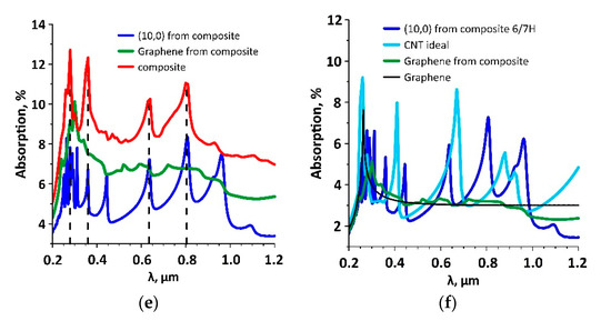 Absorption spectra of graphene/SWCNT composite films with different SWCNTs and distances H1/H2 between them: (a) film with SWCNTs (10,0), numbers 1–5 correspond to H1/H2 of 6/7–6/11 hexagons; (b) film with SWCNTs (12,0), numbers 1–5 correspond to H1/H2 of 7/8–7/12 hexagons; (c) film with SWCNTs (14,0), numbers 1–5 correspond to H1/H2 of 8/9–8/13 hexagons; (d) film with SWCNTs (16,0), numbers 1–5 correspond to H1/H2 of 9/10–9/14 hexagons; (e) film with SWCNTs (10,0) and H1/H2 6/7 hexagons film components; (f) graphene and SWCNT in the composite film with SWCNTs (10,0) and H1/H2 6/7 hexagons, ideal graphene and SWCNT.