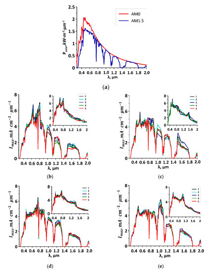 The spectra of the photocurrent with the distribution of solar radiation power over wavelengths on the earth’s surface (AM1.5) and outside the atmosphere (AM0) (in inserts) [36] are illustrated in Figure 5 for four composite film topological models with SWCNTs (10,0), (12,0), (14,0), and (16,0). The distances H1/H2 were taken similarly to the cases shown in Figure 4. It can be seen that as the diameter of composite film tubes changed, the spectral peaks shifted, and the H1/H2 ratio affected the amount of photocurrent. For the case of the film with the SWCNTs (10,0), the solar spectrum at AM1.5 demonstrates two distinct peaks at the wavelengths of 650 and 810 nm with a maximum values of 6.9 and 7.1 mA∙cm−2, respectively (see Figure 5b). These peaks corresponded to the absorption maxima in Figure 4a. Films with the SWCNTs (12,0) are characterized by only one peak in the visible range at the wavelength of 560 nm with a value of 5.95 mA∙cm−2 (see Figure 5c). With an increase in the SWCNT diameter, the value of the photocurrent for waves of visible range decreased to 4–4.5 mA∙cm−2. The reason for this is the low absorption intensity in this range, as noted above and shown in Figure 4c,d. Films with the SWNTs (14,0) and (16,0) were characterized by peaks in the IR range (see Figure 5d,e). Film with the SWCNTs (16,0) that demonstrated a clear double absorption peak at the wavelength of 1000–1100 nm also demonstrates the maximum photocurrent of 6.25 mA∙cm−2 at the same wavelength range. The film with the SWCNTs (14,0) has an absorption peak at the wavelength of ~1500 nm (see Figure 4c). However, the solar spectrum is characterized by a very low power in this part of the IR range, so there are no large current values that were observed in the photocurrent spectrum of the film with the SWCNTs (14,0). Note that all the described features of the photocurrent spectra are also valid for the case of the solar spectrum AM0.
