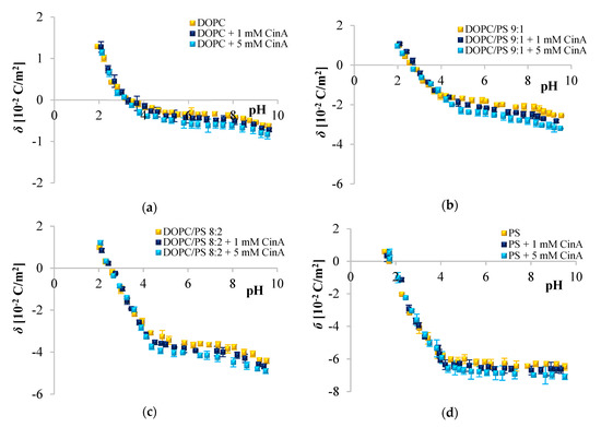 Surface charge density dependence on pH of plain and CinA-modified DOPC, DOPC/PS 9:1, DOPC/PS 8:2 and PS liposomal membrane occurred to be similarly shaped (Figure 2). An increase in positive surface charge density together with the decrease in pH values was noticed, however, only to a certain point. Conversely, along with the increasing pH, the negative charge of the membranes incremented until the plateau was reached. The visible decrease in the surface charge of PC-containing membranes at pH ~ 8.0 was possibly caused by the destruction of the membrane structure at such a high pH, which is in line with earlier reported data [7]. Our results demonstrated that in low pH, any visible alterations in values of the surface charge density were detected for all tested liposomal membranes treated with CinA. Nevertheless, at high pH values, the presence of CinA resulted in visible changes in surface charge densities of the aforementioned membranes (the negative charge of the membranes increased) compared to data obtained for plain phospholipid liposomal membranes. Those changes were apparently dose-dependent.