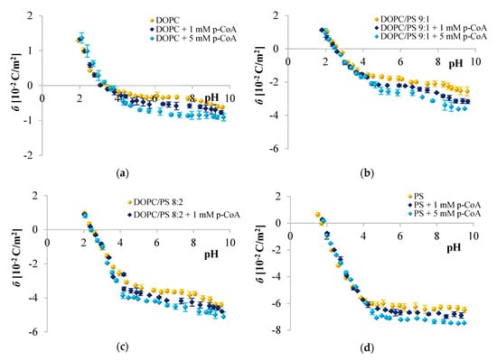 The liposomes treated with p-coumaric acid were examined analogously (Figure 3). It was found that in acidic solution, the presence of p-CoA did not affect the σ values. However, in alkaline solutions, an increase in the negative charge of p-CoA-treated membranes in comparison to plain phospholipid liposomal membranes was observed.