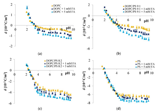The surface charge densities of the DOPC, DOPC/PS 9:1, DOPC/PS 8:2, and PS liposomal membrane, plain and modified with ferulic acid, are shown as a function of pH in Figure 4. Again, the presence of the phenolic acid did not affect the σ values at low pH, but caused an increase in the negative σ values at higher pH ranges.