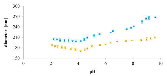 Figure 5 presents typical pH dependence of the diameter of the liposomes created with pure DOPC and DOPC modified with one of the analyzed phenolic acids, FA. Of note, in pH > 4, the sizes of plain DOPC liposomes and DOPC modified with ferulic acid increased with increasing pH of the medium, whereas in pH ~ 4 (isolectric point of the system), the diameter of analyzed liposomes was the lowest.