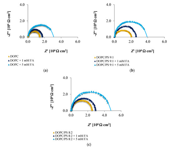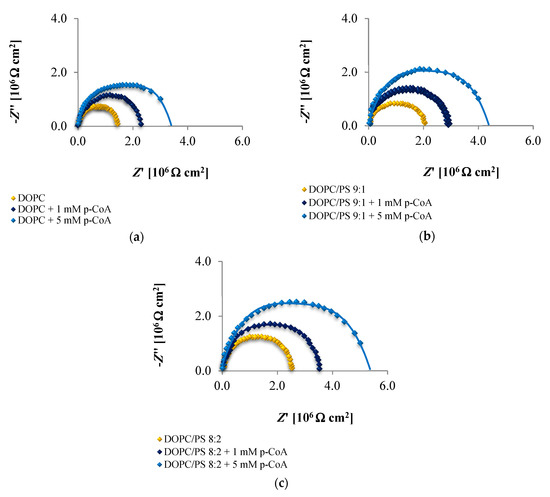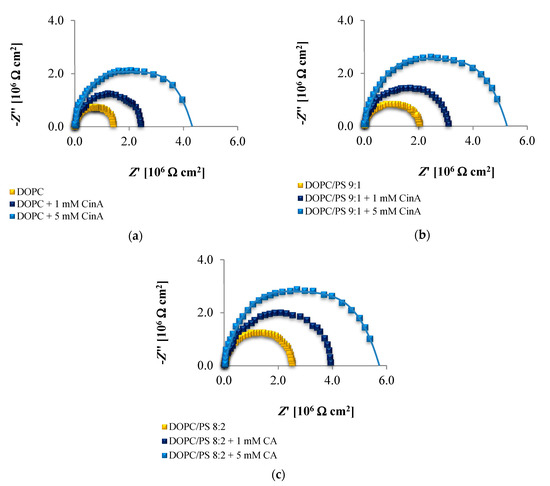 Figure 6 displays the impedance response in the form of Nyquist plots of different spherical bilayers, with varied concentrations of CinA. Notably, the plot registered for each bilayer contains a capacitive arc across the entire frequency range. The diameter of the arc corresponds to the membrane resistance. The incorporation of the CinA into the DOPC, DOPC/PS 9:1 or DOPC/PS 8:2 membrane resulted in an increase in the Rm values (compared to the values obtained for bilayers with the same lipid composition but without phenolic acid), confirming that this compound is active at the tested concentrations.