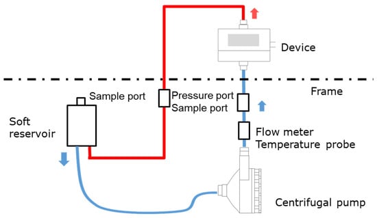 Schematic of an experimental apparatus for analyzing fluid flow in a device; a closed-circuit connected to a soft reservoir.