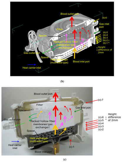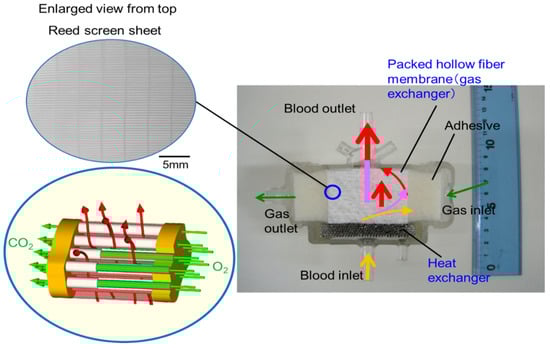 The basic design of the prototype is the structure in which heat exchanger (stainless-steel tubes), gas exchanger (packed hollow fiber membrane), filters, and spacers that partition them are laminated. The reed screen sheets composed of hollow fiber membranes are alternately laminated to attain the multilayer structure of the hollow fiber bundle. Blood flows from the bottom center of the device and is perfused in between the stainless-steel tubes and then crossflows through packed hollow fiber membrane, which is defined as the outside blood flow membrane oxygenator (Figure 8a, Figure 9). The contacting pattern between the blood and the exchange fluid (gas, heat carrier) is the crossflow. In the crossflow, the fluid streams flow perpendicular to each other to achieve the turbulent flow of blood, reducing the boundary layer of blood side and increasing gas transfer rate. The outside blood flow membrane oxygenator also has the advantages of lower blood priming volume and blood pressure drop, which allow the wide range of blood flow rate at clinical operations, compared with the inside blood flow membrane oxygenator [12,13,24]. The design of the membrane device determines the performance and safety of the membrane oxygenator. The characteristics of the currently used membrane oxygenators have been shown in the previous study [24]. Compared with these membrane oxygenators, the membrane oxygenator produced in our study has key parameters, such as membrane area, blood flow rate, and priming volume, that are an order of magnitude smaller [24], so our membrane oxygenator has completely different characteristics compared with previous membrane oxygenators. Therefore, our study is extremely useful from a practical point of view.