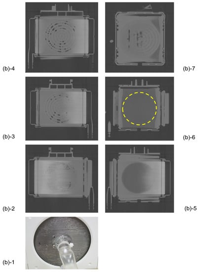 Figure 6 shows the plane cut views of Sample A during RO water perfusion. There were air bubbles displayed in black at the interface between the spacers and the outer peripheral part (Figure 6(b)-2~4). The blood inlet is located in the bottom center of the device, the blood flow velocity is higher in the center and slower in the outer periphery. Therefore, uneven flow (channeling) and air/ blood retention are to occur at the outer periphery of the device. From Figure 6, air and blood retention occurs at the boundary surface and outer periphery of spacers constituting the laminated structure, which affects blood coagulation reactions and thrombosis.