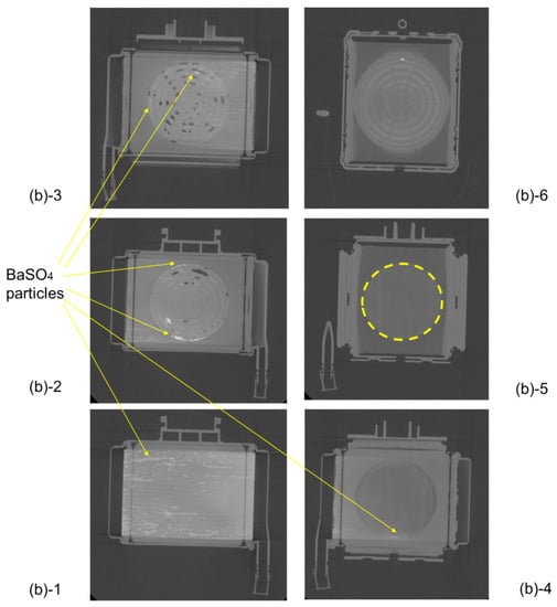 Plane cut view (from top) images of the membrane oxygenator (sample A) by high-power X-ray computed tomography (during RO aqueous solution of 10wt% BaSO4 perfusion). Compared with Figure 6, retention of bubbles and X-ray contrast agent particles (BaSO4) were more noticeable in the heat exchanger, 1st, and 2nd spacers (Figure 7(b)-1~4). There were many air and BaSO4 particles at the interface between the spacers and the outer peripheral parts (Figure 7(b)-1~4).