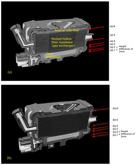 Figure 5 shows the plane cut views of the yellow arrow in the vertical view image of Figure 3b. Figure 5(b)-1 shows the interface between the heat exchanger and blood flow channel. A large number of stainless-steel tubes forming the heat exchanger are arranged in the lateral direction and appear to overlap the blood flow channel. Figure 5(b)-2 shows the plane cut view about 2 mm above Figure 5(b)-1. Figure 5(b)-2 is the interface between the heat exchanger and spacers, the air layer in between the spacers was observed to be black. Figure 5(b)-4 is the interface between the heat exchanger and the packed hollow fiber membrane. Figure 5(b)-5 is the packed hollow fiber membrane layer, and the area inside the yellow dotted circle is the blood flow channel. Figure 5(b)-6 is the interface between the packed hollow fiber membrane layer and the arterial filter. The wavy arterial filter was observed to be white. As described above, non-destructive visualization by high-power X-ray computed tomography (CT) enables detailed observation of the internal structure of the membrane oxygenator composed of various materials.