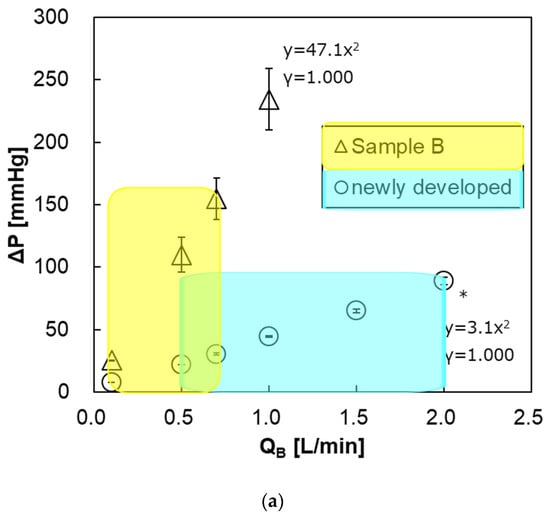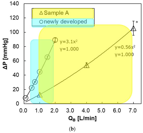 The relationship between pressure drop of the blood flow channel and blood flow rate. * Two-way analysis of variance (two-way ANOVA, p < 0.05). Blue and yellow areas represent the recommended ranges of blood flow rate. (a) newly developed pediatric membrane oxygenator (prototype) vs. commercially available membrane oxygenator (Sample B). (b) newly developed pediatric membrane oxygenator (prototype) vs. commercially available membrane oxygenator (Sample A).