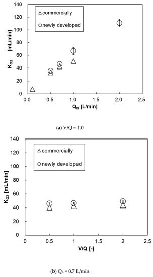 Figure 14a shows the relationship between the blood flow rate and oxygen transfer rate of both pediatric membrane oxygenators. The oxygen transfer rates of both oxygenators were almost the same, and there was no significant difference. This is because that the new membrane oxygenator has a larger priming volume (37 mL > 31 mL) and the blood flow velocity is low, and the resistance in the blood-side diffusion boundary layer is larger during oxygen transfer, thereby decreasing oxygen transfer rate per membrane area [11,12,13]. Figure 14b shows the relationship between V/Q and oxygen transfer rate at QB = 0.7 L/min. There is no significant difference in the oxygen transfer rate between the two membrane oxygenators at V/Q = 0.5, 1, and 2. Additionally, the oxygen transfer rate does not increase even if the gas flow rate is increased, under which the blood flow rate is limited.