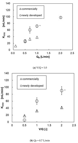 The relationship between carbon dioxide transfer rate and blood flow rate of both pediatric membrane oxygenators, (a) V/Q and (b) QB = 0–2 L/min, V/Q = 0.5–2. * Two-way analysis of variance (two-way ANOVA, p < 0.05).