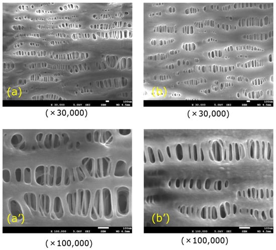 FE-SEM images of the surfaces of the capillary membrane (Sample A), (a) inner lumen surface, and (b) outer surface.