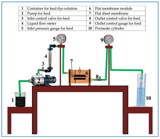 The pure water flux (PWF) of the pristine and PES–PVP–GO membranes was measured using the cross-flow filtration process shown in Figure 1. The effective membrane filtration area was 16 cm2. Initially, each membrane sample was pre-compacted for at least 90 min until the flux stabilized at 3 bar. Then, filtration tests were conducted at a steady pressure of 3 bar and temperature of 25 ± 1 °C.