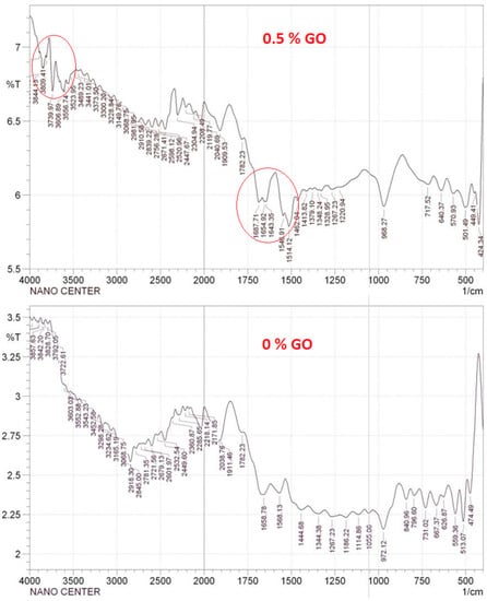 The hydrophilic effect of GO can increase the exchange rate between the solvent and nonsolvent during membrane formation [45]. This leads to higher porosity on the membrane surface (Figure 7) and enhances the permeation flux of water (Figure 7). However, when the GO concentration was higher than 0.5 wt%, the viscosity of the coating solution increased, which led to a decrease in the pore size and the porosity of the membrane [53] and may lead to a decrease in the water permeation flux. A similar behavior was observed by Wang et al. [31] for GO-modified PVDF membranes.