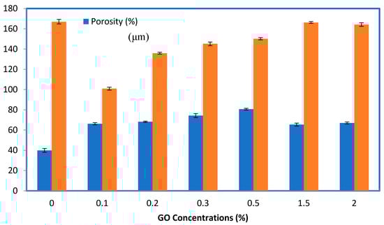 Membrane porosity is also a critical parameter that affects membrane performance. The porosity of the membranes for the control PES and GO/PES membranes at different concentrations of GO is displayed in Figure 4. The porosity of the membrane was highly enhanced from 39.92% for the control PES to 80.6% when the concentration of GO was 0.5 wt%. With further increases in the amount of GO (1.5 and 2 wt%), the porosity of the composite membranes declined significantly to 65.4% and 67%, respectively. These results are comparable to previous studies, where an increase in the content of hydrophilic additives led to larger void sizes and higher porosity [47]. The SEM results confirmed the measurements of the membrane thickness and porosity. Figure 4 also shows the effect of GO-NPs concentrations of the thickness of PES membranes. At lower concentrations of GO-NPs in the casting solution, the demixing process becomes faster, which in turn leads to a decrease in membrane thickness, whereas on the other hand, at higher concentrations of GO-NPs in the casting solution, the demixing process becomes slower as the concentration or content of the solid material is increased within the membrane, which leads to an increase in membrane thickness.
