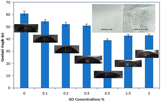 The water contact angle of the membrane is a good indicator of the hydrophilicity of the membrane. A lower contact angle indicates that the membrane surface is more hydrophilic. The contact angle results of the control PES and modified GO/PES membranes are shown in Figure 5. As observed in Figure 5, when the GO nanoparticles were added to the polymer matrix, the water contact angle decreased significantly. The control PES showed the highest water contact angle (60.82°). Adding 0.5% by weight to the casting solution reduced the water contact angle to 39.21°, signifying that the membrane surface is hydrophilic. After adding higher concentrations of GO (1.5 and 2 wt%), the contact angle increased slightly, with no significant effect in reducing the hydrophilicity of the membrane. This may be due to the aggregation of GO and the reduction in the effective surface of the particles at high mixing ratios, which in turn led to a decrease in the number of GO functional groups on the membrane surface. During the phase inversion process, the blended nanoparticles in the casting solution could migrate to the top surface of the composite membrane to reduce the interfacial energy [45,48], which can be seen in GO composite membranes. The photos of the top surface of the control and the prepared membrane with a concentration of 0.5 wt% GO were displaced in Figure 5. The results showed that the top surface of the composite membrane was darker than the control PES membrane which was white and clear. During the phase inversion process, as the top layer was more exposed to water, the GO particles moved to the top surface of the membrane. This migration supported more GO functional groups on the membrane surface and improved its surface hydrophilicity. Similar results have been reported in the literature for GO embedding in polysulfone membranes (PSF) [49] or carbon nanotubes (CNT) in the matrix of polyethersulfone membranes [44,50].
