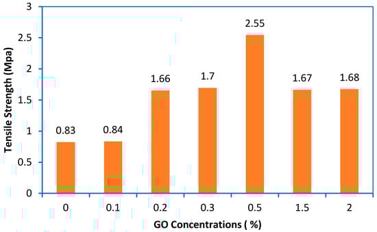 Figure 6 shows the results of the tensile strength test for the control and modified PES membranes. The membranes showed a gradual improvement in tensile strength from 0.83 MPa for the control PES to 2.55 MPa with GO at 0.5 wt%. At lower concentrations of GO, the tensile strength of the mixed matrix membranes increased and achieved an optimum value at 2.55. The reason might be that a uniform distribution of the GO-NPs was achieved at a rate of 0.5%. This was confirmed by the results of EDX (Figure S2 in the Supplementary Information). Therefore, a concentration of 0.5% is considered as the best addition of GO-NPs to the casting solution. Another reason for obtaining an ultimate strength at 0.5% of GO is that no agglomeration was achieved during the preparation of the casting solution as a lower concentration was used. However, at higher concentrations of GO-NPs, the tensile strength reduced to 1.67 and 1.68 at 1.5 and 2% of GO-NPs, respectively. This is due to a decrease in the movement of the polymer molecules, which increases the resistance of the material to plastic deformation [51].