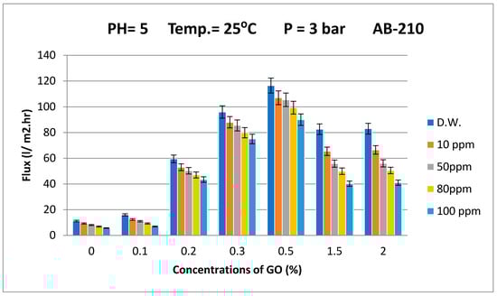 It has been documented that increasing the surface hydrophilicity will affect the permeation flux of water [30]. Figure 7 shows the results of the permeation flux of the synthesized GO/PES membrane using distilled water (DW) and the simulated wastewater of different concentrations of Acid Black dye (i.e., 10, 50, 80, and 100 ppm) at a pressure of 3 bar and pH = 5, with the temperature of the feed solution 25 ± 1 °C. As shown in Figure 7, the trend of increasing water permeation flux is very consistent with decreasing contact angles (Figure 5). The permeate flux of the membrane increased as the amount of GO particles increased. When the GO content was 0.5 wt%, the maximum water flux was 116.5 LMH because this membrane had the highest porosity, average pore size, and lower contact angle. However, the GO content of 1.5 and 2 wt% led to a decrease in the water flux to 82.3 and 83 LMH, respectively. The decrease in the permeate flux can be attributed to pore blockage caused by the high GO content [52], which indicates a decrease in porosity (Figure 4). The reason for using different concentrations of GO is to study the agglomeration phenomena of nanoparticles within the membranes. In fact, the agglomeration of nanoparticles is a serious problem and would lead to undesirable changes in the properties of the membrane, including lower water flux and weakening membrane mechanical strength. Therefore, to avoid this problem, a lower concentration of nanoparticles is recommended and proposed by many researchers.