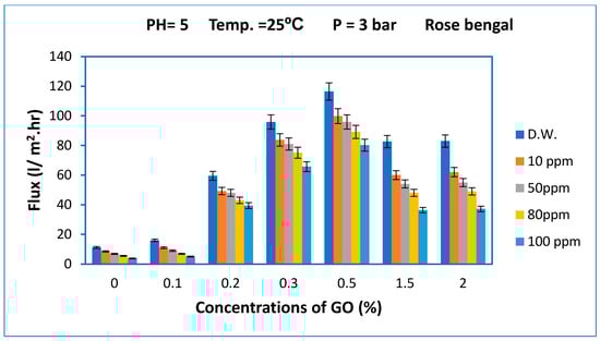 Effect of the Rose Bengal dye concentration in feed solution on the permeation flux of the membrane prepared at different GO concentrations. The bar height is the average of five measurements of permeation flux and the error bars represent ± one standard deviation.