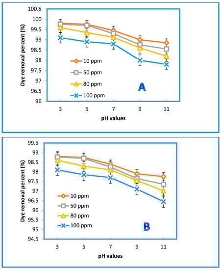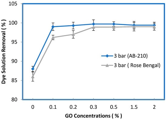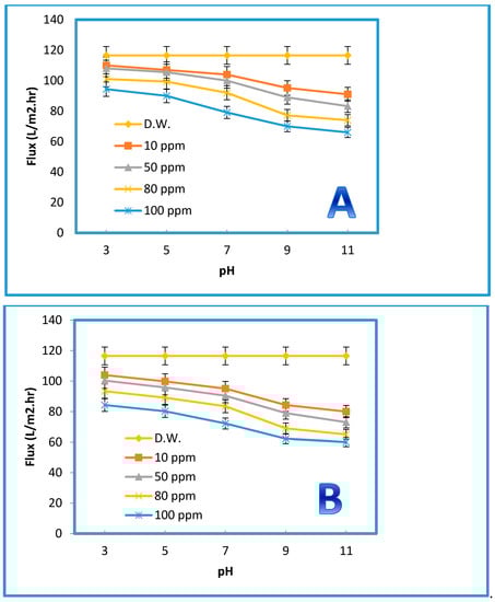 Changing the zeta potential by changing the pH of the solution can critically influence the performance of the membrane separation. Measurements of zeta potential are not only essential for obtaining insight into the retention mechanisms for disparate charged solutes but also for understanding membrane aging, fouling, functionalization, and cleaning. Changing the pH value will not only dissociate the surface functional groups but also induce the membrane to acquire a charge from the adsorbed molecules in the feed [56]. The pH of the feed solution could influence the degree of ionization and speciation of the dyes [57]. A wide range of pH values (from 3 to 11) was employed to examine the membranes’ performance behavior in terms of their permeate flux against both dyes. As displayed in Figure 12, there was a clear influence of the pH on the permeate flux of the blended membrane prepared from 0.5% GO (i.e., the optimum concentration). However, a slight decrease in the permeation flux was observed at pH = 7, while beyond this value at a higher pH, the decline of the permeation flux became more significant for both dyes at all concentrations (i.e., 10, 50, 80, and 100 ppm). Interestingly, the pure water flux did not manifest any change, indicating that PES membranes can tolerate a wide pH range. Additionally, a higher flux decline was observed at higher concentrations (e.g., 100 ppm). This was probably caused by the dissociation of the functional groups of the organic dyes, along with the dissociation of the membrane surface. Indeed, reducing the interactions between the membrane surface and these molecules would have accelerated their deposition on the surface. The removal rates were calculated for both dyes at the optimum concentration (0.5% GO) at different pH levels. Figure 13 illustrates the impact of 0.5 wt% GO on the removal % of both dyes. As shown in Figure 13, different concentrations of the AB-210 and RB dyes were used. The rate of dyes removal decreases gradually by increasing the concentration of the dye as well as for the relationship between pH with the rate of removal where the rate of dyes removal decreases significantly by increasing the value of pH (basic condition). Additionally, the dye removal % for Rose Bengal was lower than the dye removal % for Acid Black-210 because the molecular weight of Rose Bengal (1017 g/mol) is slightly higher than that of AB-210 (938.017 g/mol) [58,59].
