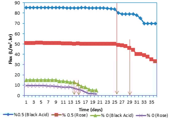 Under extreme conditions (such as pressure and temperature), periodic exposure of the membrane to the cleaning agent will negatively affect the physical properties of the membrane, which in turn may affect the performance of the membrane. As such, the quality and quantity of products may be affected. In addition, in a cross-flow system, contamination may occur in the membrane module, and the contamination cannot be effectively removed through an organized process. Therefore, it is often necessary to study the life of the reusable membrane to ensure that the membrane will not collapse over time during the filtration process, where it can affect the products and even the process itself [14]. Therefore, this work also investigated the long-term consequences of processing two dyes using membranes fabricated from the control PES and PES–PVP–GO with 0.5 wt% GO, finding that the GO/PES membrane provided optimal performance. Figure 10 depicts the long-term UF operation carried out for the 0.5 wt% GO (GO/PES) membrane at a pressure of 3 bar and feed temperature of 25 °C for 50-ppm Acid Black and Rose Bengal dye solutions. Figure 10 demonstrates that the permeation flux of the Acid Black solution using the control PES membrane was stable between 13 and 15.1 L/m2·h throughout the UF operation for 14 d before the permeation flux began to decline. In contrast, the long-term operation of the membrane fabricated from 0.5 wt% GO using an Acid Black dye solution improved greatly over 26 d, and the permeation flux remained stable between 85.2 and 80 L/m2 h.