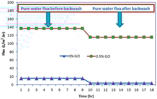The membrane used in the ultrafiltration system should be able to restore its water permeability after contact with wastewater. Therefore, it is necessary to evaluate and compare the flux before and after ultrafiltration. After completing the long-term performance experiment, the flat sheet PES-UF membrane was backwashed with pure water for 9 h at 3 bar, after which the pure water flux was measured again (see Figure 11). Figure 11 shows that the water flux after backwashing was lower than that in Figure 7, which was caused by the dye and contaminants remaining on the surface of each membrane. This phenomenon will cause a sudden drop in flux during long-term operation. In contrast, for the 0.5 wt% GO concentration, the adsorption effect between the dye pollutant and the membrane was very weak because of the beneficial hydrophilic property of the membrane; therefore, the dye can be easily washed away from the membrane surface containing the GO particles after the backwash. Finally, the membrane surfaces returned to being white in color, and the pure water flux recovered.