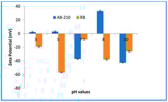 Moreover, according to the zeta potential measurements displayed in Figure 14, the two dyes possess negative surface energy. Therefore, the two anionic AB-210 and Rose Bengal dyes showed less degradation due to the lower binding affinity caused by their negative charge. Furthermore, because of the acidic functional groups of GO, it can prompt negative charge on the membrane composite surface, causing high rejection between negative surface and negative dye.