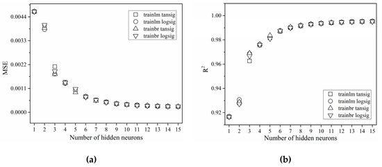 In the case of the neural network model with the Bayesian regularization and hyperbolic sigmoid function (network type D), a decrease of MSE could be also noticed when the number of neurons in the hidden layer was increased (Figure 1a). A minimal value of MSE and maximal value of R2 were achieved with 15 neurons in the hidden layer, 2.74 × 10−4 and 0.99513, respectively. On the other hand, when using neural network model with Bayesian regularization and hyperbolic logistic function (network type C), minimal value of MSE (2.74 × 10−4) and maximal value of R2 (0.99515) were achieved with 14 neurons in the hidden layer.