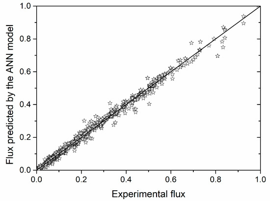 Normalized experimental permeate flux values plotted against the flux values predicted by the ANN (artificial neural network) model.