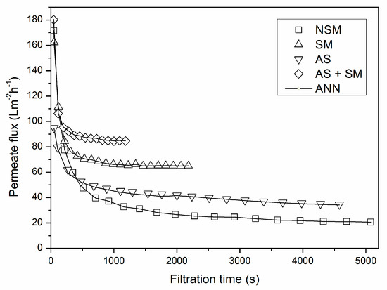 Modeling of permeate flux decline represents an intricate problem due to complexity of the phenomena occurring during the microfiltration processes [9,27]. It is usually based on theory (applying physical, chemical, and hydrodynamic modeling parameters) or on empirical correlations developed on specific experimental data [28,29]. Considering the wide range of different phenomena during fouling of microfiltration membranes, a development of a flexible model is very difficult, thus, the dynamic models of microfiltration are relatively rare [27]. Frequently, traditional models are inadequate when applied for complex biological and inorganic feeds [30]. Modeling of flux decline can be very challenging for microfiltration of complex mixtures (such as cultivation broths), especially in combination with complex flow arrangements related to the application of the techniques for fouling mitigation [31]. For that reason, application of so called black-box models (such as artificial neural networks, ANN), is much simpler compared to traditionally established models. ANN do not require detailed knowledge of the system, which is especially important when functional dependence between the system inputs and outputs has not been clearly formulated or defined [32].