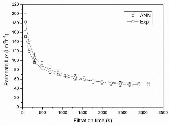 As can be seen in Figure 4, the selected ANN network is capable of satisfactorily simulating experimental data for the experiment. The majority of the predicted flux values falls in the range of 10% error. The most significant prediction error is noticed at the beginning of microfiltration operation. The reason for this can be found in the rapid flux decline at the beginning of Bacillus velezensis broth microfiltration. Cultivation broth is a complex mixture of various components that can cause severe membrane fouling in the initial phase of microfiltration [8,11,14,16]. This contributes to reduced ANN prediction capabilities in this region. A relatively small number of flux value experimental observations during the initial microfiltration period results in limited number of data provided for the network in the training stage. This limitation can be avoided by capturing more flux values in the initial microfiltration phase, thus improving predictability of the network at the beginning of the microfiltration period.