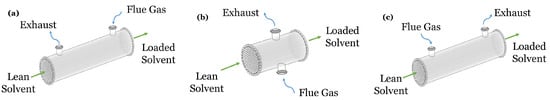 Carbon capture membrane contactors come in many configurations: tubular/hollow-fiber [], spiral wound [], and flat sheet []. A common geometric configuration used in PCC is the hollow fiber membrane contactor (HFMC), and this particular design will be the focus of this review paper. HFMCs consist of many long, narrow, hollow fibers packed into bundles. HFMCs are manufactured by first creating a woven fabric-like bundle using a rotating wheel []. The ends of the bundle are then fused shut and undergo centrifugal potting to form a tubesheet. This tubesheet’s ends are then cut to recreate open-ended fibers. The bundle with tubesheet ends is then placed inside a case that has two ports for the permeate fluid and two headers at each end for the inside of the hollow fiber, known as the lumen access port []. HFMCs for PCC systems are relatively inexpensive, have a high surface area per unit volume, and are easy to seal, preventing leakage. HFMCs are also relatively easy to model compared to other CO separation methods due to their simple geometry and flow configuration. HFMCs are commonly operated in a counter-flow configuration (where the sweep gas or solvent runs in the opposite direction that the exhaust gas flows). However, they can also be operated in co-flow (where sweep runs in the same direction to the exhaust) or in cross-flow (where sweep runs perpendicular to the exhaust), as seen in Figure 1.