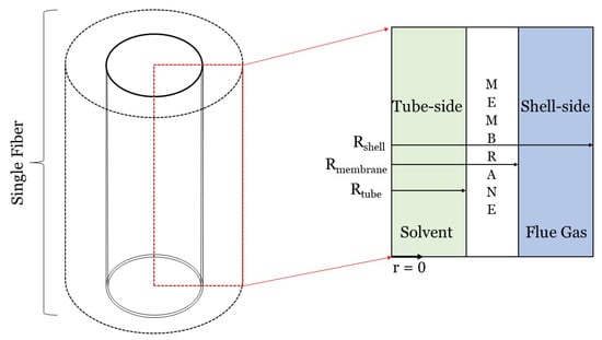 Dimensionality reduction is a convenient, established, and powerful method for simplifying the system of the coupled partial differential equations (PDEs) that need to be solved for an adequate modeling representation of physico-chemical phenomena and devices, decreasing drastically the computational cost of any numerical implementation. If symmetry around an axis along the longitudinal direction of a HFMC can be justified, a 3D hollow fiber can be as reduced and effectively studied by a 2D model, where angular variations can be ignored for both concentration and velocity, e.g., Reference [,,,,,,,]. Further simplification can be achieved, if translational invariance for the fluid flow is also imposed upon our model along the longitudinal direction, making the axial component of the velocity dependent only on the radial coordinate []. An additional reasonable assumption can also be made based on the fact that the dominant component of the mass-transfer driving force, is usually perpendicular to the direction of the flow []. All the above taken together, result in an 1D model, where angular and axial variations of mass transfer can be neglected []. This section focuses on 1D models of carbon capture HFMCs. As shown in Figure 2, the radial dimension, or r, is typically the one dimension that is resolved in 1D HFMC models [,,]. Although the flue gas and solvent streams can flow on either side of the fiber, we assume in Figure 2 and the following equations that solvent flows on the tube-side and that flue gas flows on the shell-side, like, for example, in Reference []. All theory presented in this paper will consist of three domains: the tube, membrane, and shell domains. One-dimensional models of HFMCs should either include a mass transfer coefficient or a model that describes the permeate(s) passing through the membrane. This section will focus first on using the resistance-in-series method to calculate mass transfer coefficients. The solution-diffusion and pore flow models will then be discussed briefly.