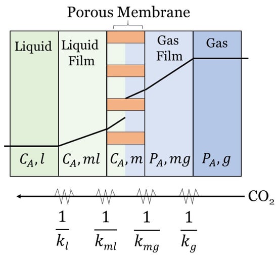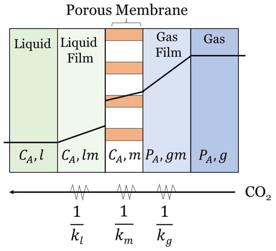 The resistance-in-series (RIS) approach is often used to model the overall mass transfer coefficient (MTC) of individual fibers. For the purpose of this review paper, the RIS model will be considered as a 1D model with the mass transfer occurring in the radial direction. The RIS method is widely applicable to HFMC models and can even be used to model multi-stage HFMCs and a range of flow patterns [,]. It is a simple, effective means of determining the rate of CO transfer in HFMCs. The RIS method relies on mass transfer resistances, which are analogous to electrical resistors wired in series []. RIS is a simple method that breaks down the mass transfer process in a carbon capture HFMC into a series of steps: CO diffusion through the gas, CO diffusion through the membrane, and CO diffusion through the liquid (as shown in Figure 3). The RIS model for HFMCs is derived from double-film theory, where two fluids (i.e., two films) are considered with a membrane in between []. The double-film theory describes mass transfer resistance at the interface(s), or film(s), of the liquid, porous media, and gas phases []. Figure 3 illustrates the mass transfer through a non-wetted porous membrane for the three domains, where is the partial pressure of component A in the gas phase, and is the liquid concentration of component A.