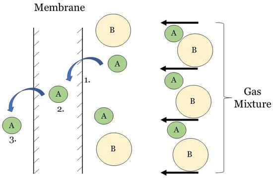 Graphical depiction of the solution-diffusion three-step process in a carbon capture HFMC for gas mixture of molecule A and B: 1. Molecule A sorption at the gas-membrane interface, 2. Molecule A diffusion through the membrane, and 3. Molecule A desorption at the solvent-membrane interface. The permeants are separated because of the differences in the solubilities and the variations in the diffusive rates of the different flue gas species in the membrane [,].