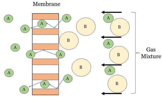 The solution-diffusion model is a standard 1D model for dense, non-porous polymeric membranes and as such is not frequently encountered for modeling HFMCs. The permeants are separated because of the differences in the solubilities and the variations in the diffusive rates of the different flue gas species in the membrane. This transport mechanism occurs in the reverse osmosis, pervaporation, and polymeric gas separation membranes. The lack of micro-pores, reasonably justifies the assumption of constant pressure throughout the membrane and the concentration difference being the mass-transfer’s driving force []. This model follows gaseous CO as it undergoes a three-step process (shown in Figure 5): (1) CO sorption onto the membrane’s on the gas side, (2) CO diffusion through the membrane, and (3) CO desorption from the solvent side of the membrane [,].