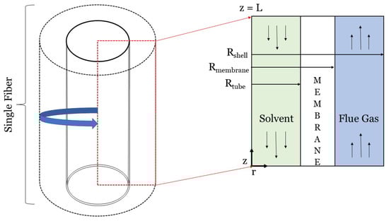 Two-dimensional modeling of carbon capture HFMCs typically consists of modeling a single hollow fiber. However, 2D modeling can more precisely account for physics and transport than 1D models by incorporating axial diffusion and convection [,,]. To computationally model axial and radial mass transfer characteristics (diffusion, convection, and chemical reactions), a complete mass transfer analysis is necessary using governing equations and constitutive laws. Figure 7 will be used throughout this section to walk through the theory that should be followed to complete a mass transfer analysis for a HFMC. Figure 7 illustrates the 2D modeling framework for a single hollow fiber in a counter-flow HFMC, where liquid solvent flows on the tube-side and flue gas flows on the shell-side. Once the general governing equations and laws are introduced, the equations and laws will be applied to the system presented in Figure 7. These equations will then be modified to account for membrane wetting. It should be noted that this section will demonstrate computation fluid dynamics (CFD) modeling theory behind a single 2D-axisymmetric hollow fiber. If one desires to develop a 2D model of a HFMC bundle, the results can simply be multiplied by the number of fibers in the bundle.