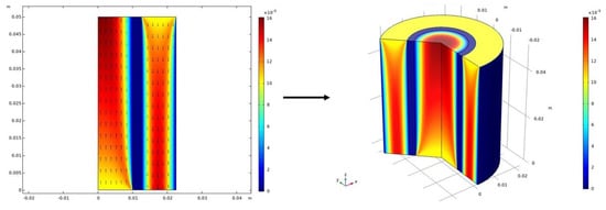 The fluid velocities on the shell and tube sides, and , are needed to solve Equations (27) and (28). These velocities are determined by using the 2D cylindrical Navier–Stokes and continuity equations based on Equations (7) and (8) [,].
