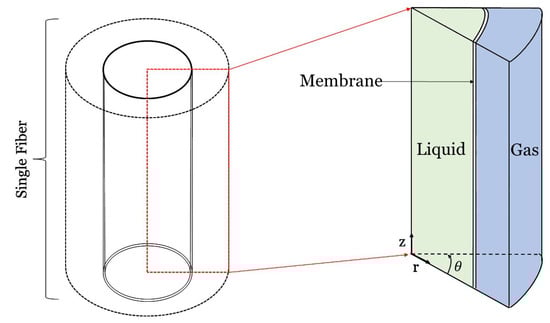 Using as starting point the balances of mass, momentum and energy presented in Section 2 accompanied by the relevant constitutive laws and applying a set of assumptions, one can get to a system of partial differential equations that mathematically represent the physical setup. For the purposes of this analysis a popular set of assumptions comprises: steady state operation, rotational symmetry for both velocity and concentration fields, translational invariance for the fluid flow, constant material properties leading to incompressibility in the form of , and constant membrane properties. The following equations are based on the cylindrical coordinates framework presented in Figure 7. The general mass balance for this system is given by Equation (25) and is derived from Equation (6) for a 2D-axisymmetric hollow fiber [].