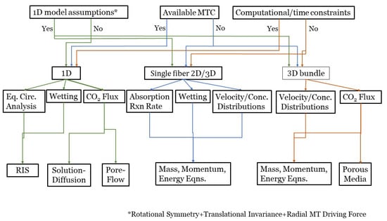 The RIS method, solution-diffusion model and pore flow model can each accurately represent the physics of CO removal from flue gas in HFMCs. The RIS method uses an estimated overall MTC to estimate the CO flux across the membrane. The solution-diffusion and pore flow models, on the other hand, do not require a MTC to be calculated. Instead, the solution-diffusion model relies on Fick’s first law of diffusion to represent the permeance of CO through the membrane as a function of concentration, and the pore flow model uses Darcy’s law and pressure difference to determine CO flux. RIS is the most popular method for 1D modeling of HFMCs. The RIS method has the advantage of being able to represent membranes that have both porous and nonporous portions []. One-dimensional models using these three approaches can accurately match experimental results, as well as 2D and 3D models [,]. The main drawback of 1D models is that they cannot capture more complex dynamics inside a HFMC fiber or bundle (e.g., concentration profiles, flow distributions), which is where 2D and 3D models add value.