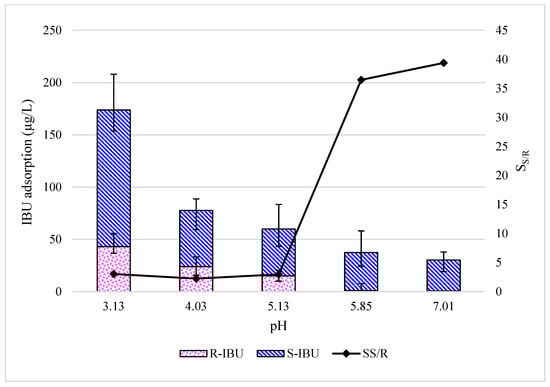 The test was repeated at a feed water pH range from 3.0 to 7.0 units, resulting in an inverse relationship between loss of enantiomeric IBU and the water quality parameter, aligning with the acid dissociation constant (pKa) of IBU (4.4). Figure 1 illustrates the results of the flat-sheet equipment adsorption experiments, where the total IBU concentration adsorbed is presented as a function of the total initial IBU concentration.