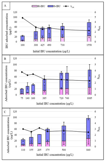 Adsorbed R- and S-IBU onto (A) Flat-sheet equipment; (B) Flat-sheet equipment with NF270 coupon; (C) Flat-sheet equipment with TS40 coupon (feed water pH of 4.0 units, temperature 20 ± 1 °C). Selectivity is a ratio of adsorption of S/R IBU. Error bars represent minimum and maximum values from triplicate analysis.