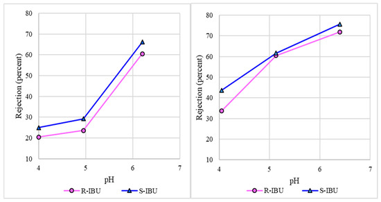 R- and S-IBU rejection as a function of feed water pH for NF270 membrane (left), TS40 membrane (right) (water flux 42.4 L/m2h, temperature 20 ± 1 °C).